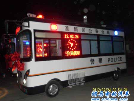 2012年2月24日下午,三臺(tái)白色車身的鴻馬流動(dòng)警務(wù)室在鴻馬電動(dòng)汽車公司長葛生產(chǎn)基地整裝待發(fā),即將前往山東上崗執(zhí)勤。這是自山東桓臺(tái)流動(dòng)警務(wù)室 、山東魚臺(tái)移動(dòng)警務(wù)站、山東濟(jì)寧市嘉祥縣“配備”流動(dòng)警務(wù)室、高唐縣交警大隊(duì)流動(dòng)警務(wù)站等等后,發(fā)往山東高新區(qū)的移動(dòng)警務(wù)室。